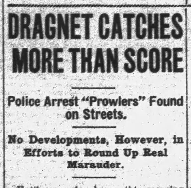 Mrs. Lillian Bales lived at 204 Bearden Place with her two daughters, Ada, aged 19, and Cleo, aged 16. On the 4th of January, 1921, a man entered their home in the early hours of a Tuesday morning. Bales woke up because someone with a flashlight tried to pull back the blankets that covered her and her sleeping daughters. Mrs. Bales cried out and woke her daughters. The intruder shined a flashlight in Mrs. Bales’ face and ordered her to stop crying. However, by then, all three women were screaming. This frightened the Marauder enough that he ran out of the house, leaving them unhurt. Bales was the widow of Fred Bales, a former Deputy Sheriff, and their two daughters were described as “responsibly employed.” Chief O’Conner assigned Detectives Day and Swaggerty to investigate the break-in.